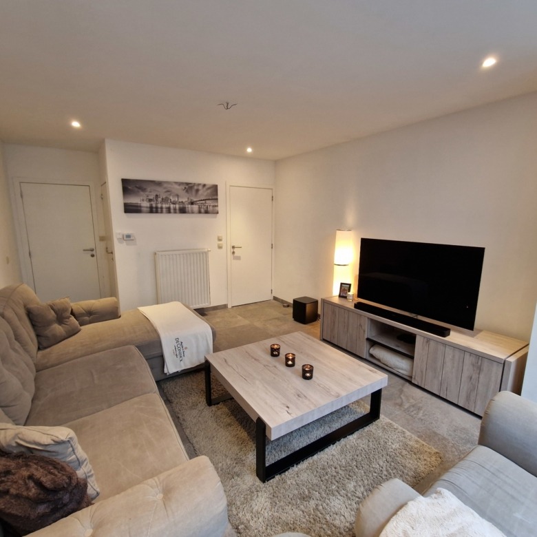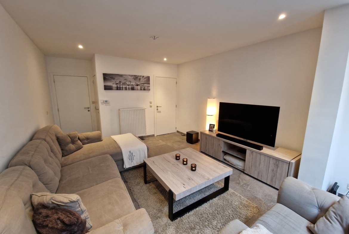 Indeling gelijkvloers: inkomhal met verzorgd bezoekerstoilet en toegang tot een ruime berging/wasplaats. Op het einde van de hal betreden we de open leefruimte met gezellige living, grote eetplaats en een moderne keuken voorzien van alle hedendaags comfort. De mix van witte muren en plafonds met inbouwspots met de grote natuursteenlook vloertegels zorgt voor een klassevolle uitstraling.