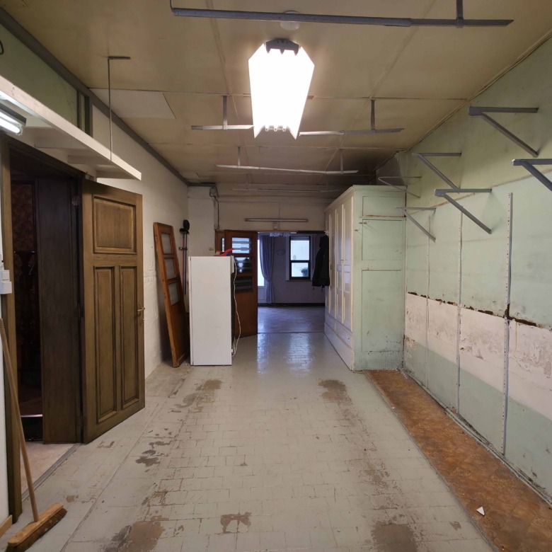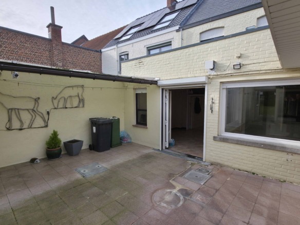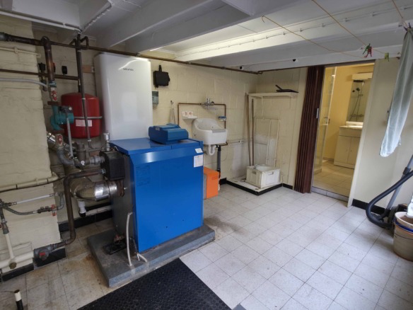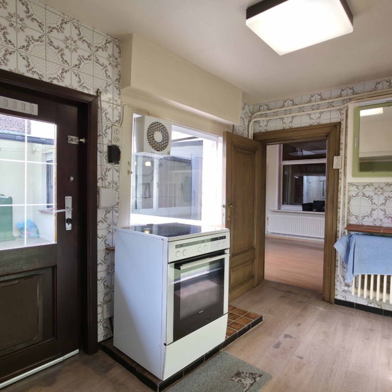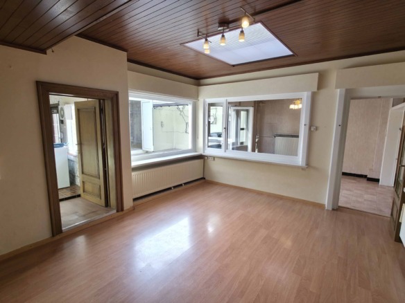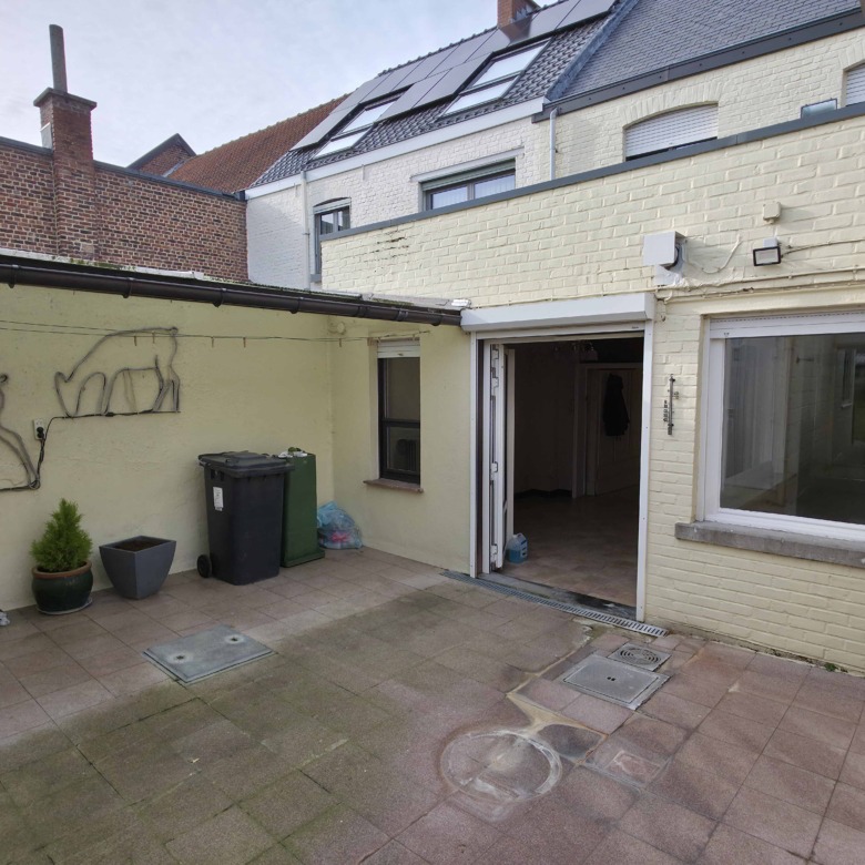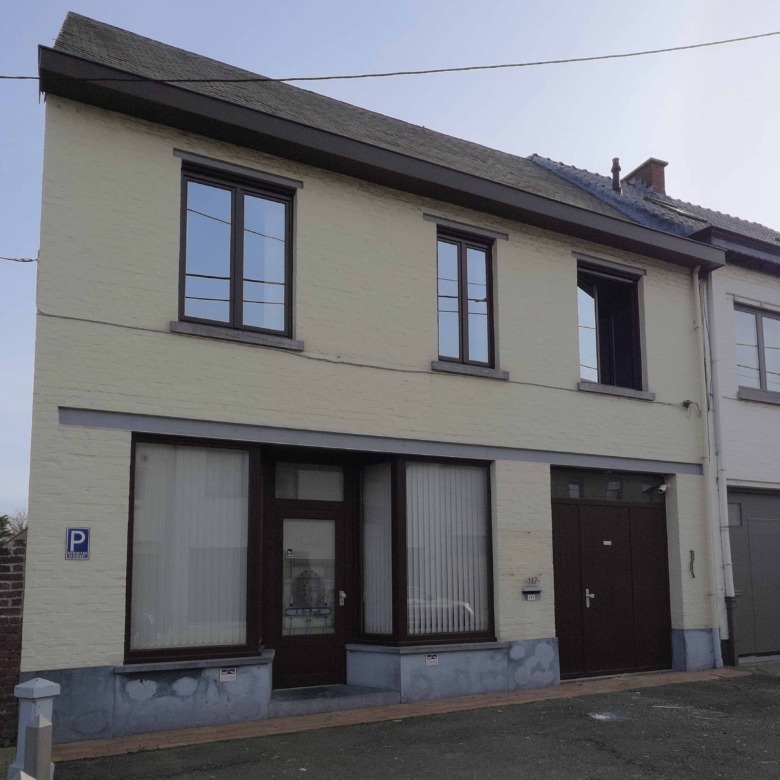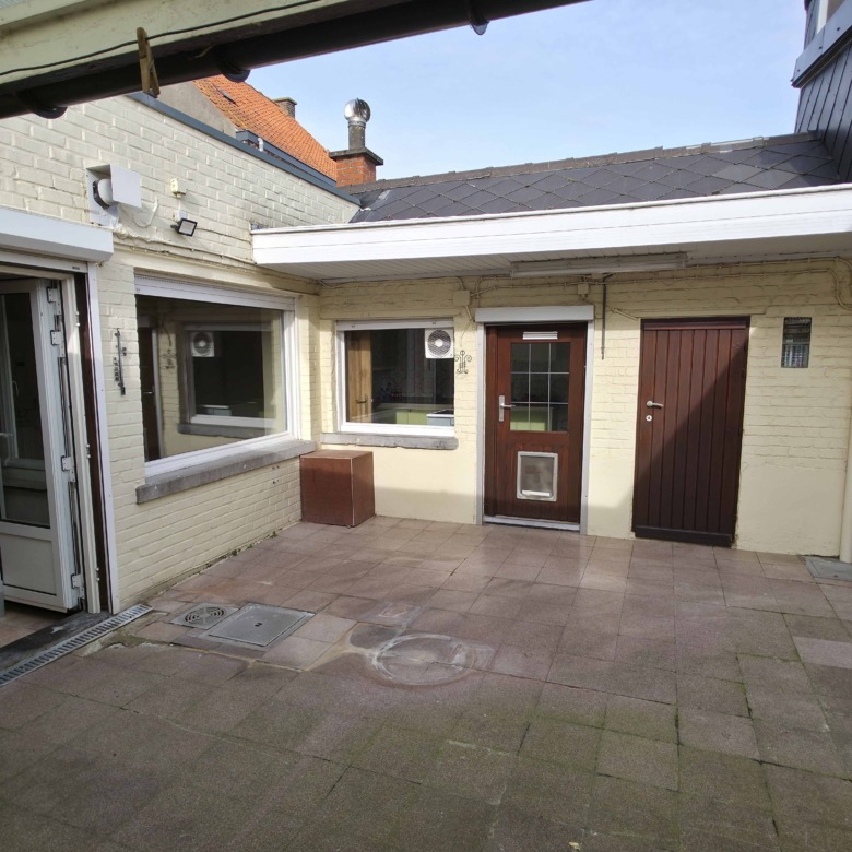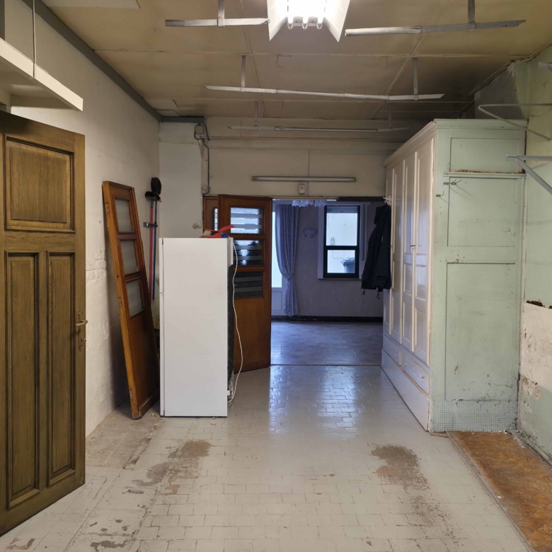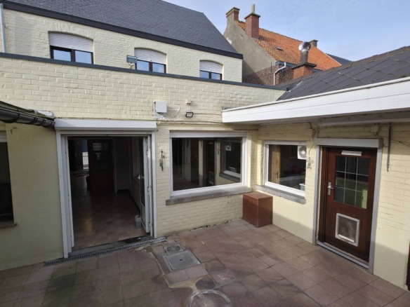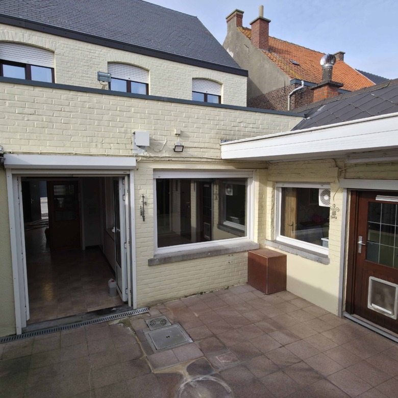 Bij binnenkomst betreedt u de woning via de voormalige winkelruimte, die toegang geeft tot de leefruimte met traphal en rechts de grote garage. Langs de leefruimte is de droge, propere kelder bereikbaar. Achter het hoofdgebouw vindt u een living en eetplaats onder het platte dak, met aansluitend een keukenruimte. Achter de keuken bevindt zich de technische ruimte met mazoutbrander en een badkamer met douche en lavabomeubel. Het apart en verzorgd toilet is ook toegankelijk langs het privatieve terras/koer. De woning is voorzien van rolluiken en deze zijn deels elektrisch op het gelijkvloers.