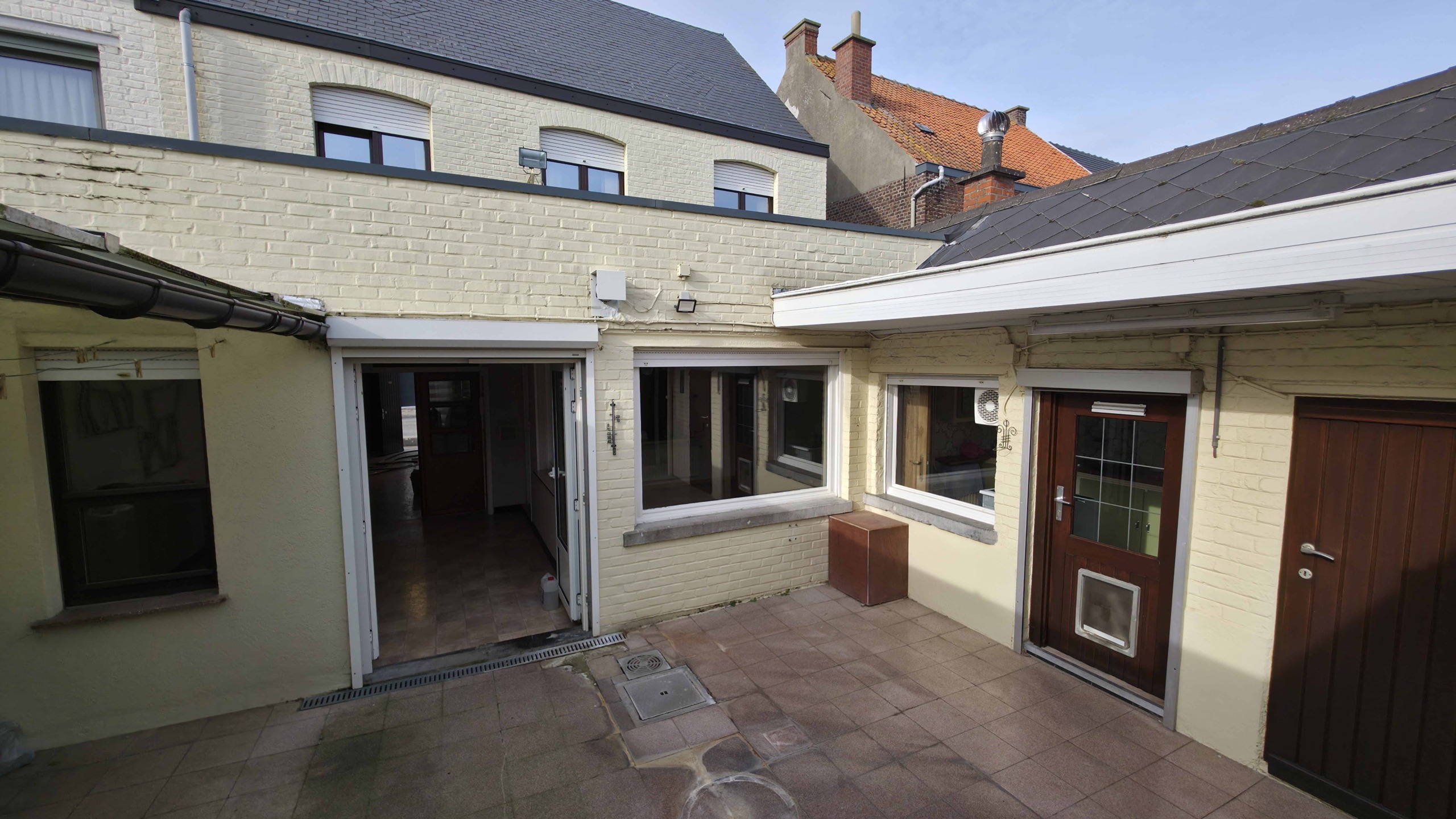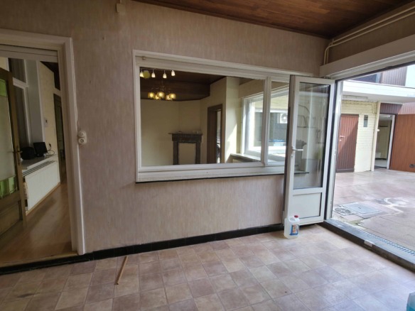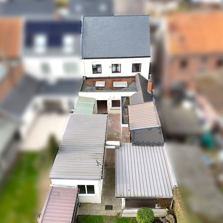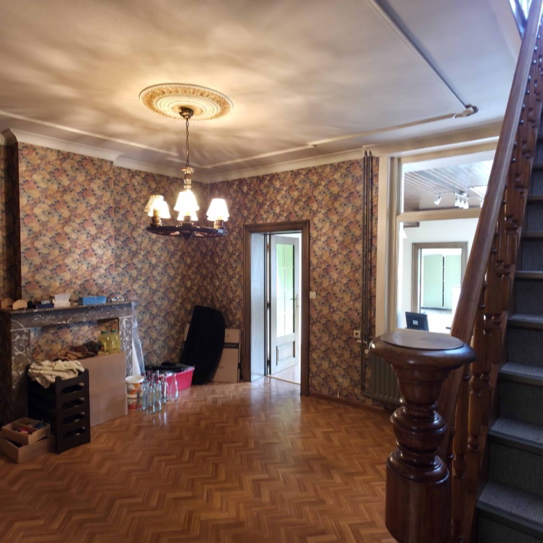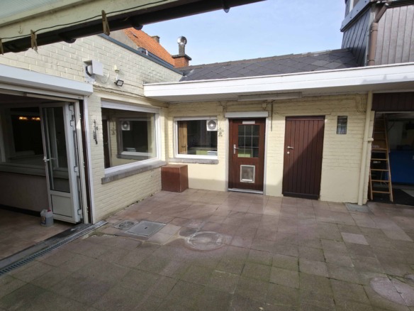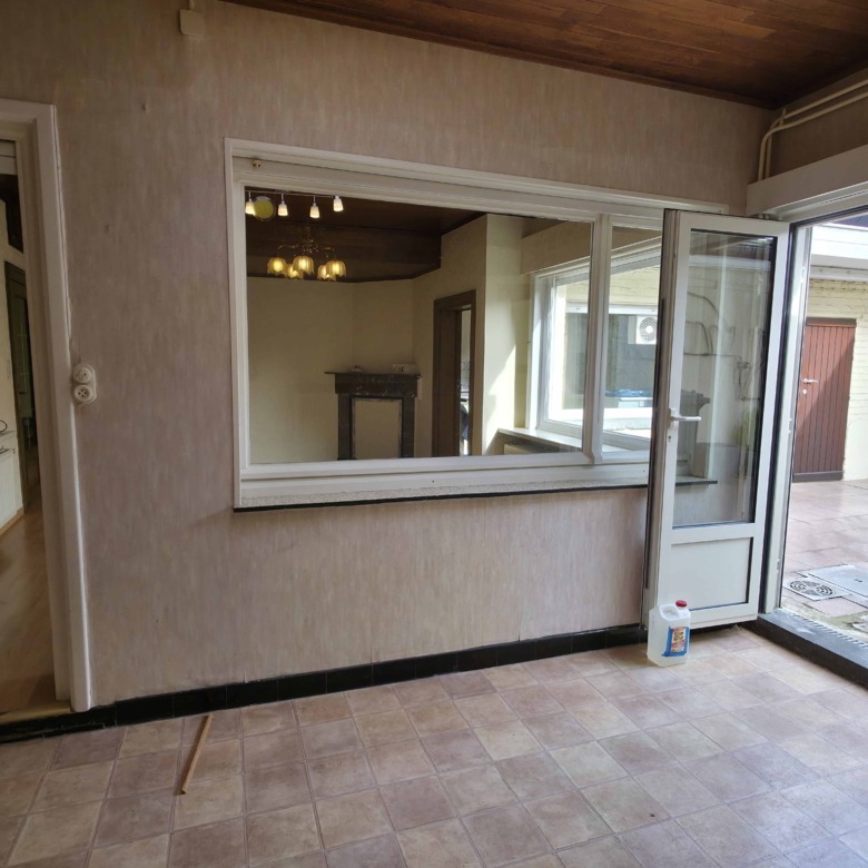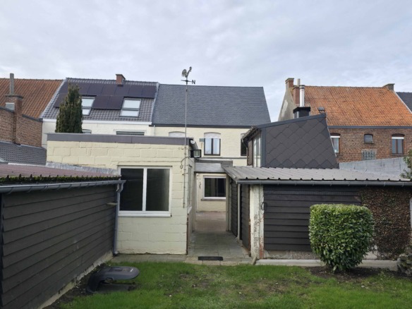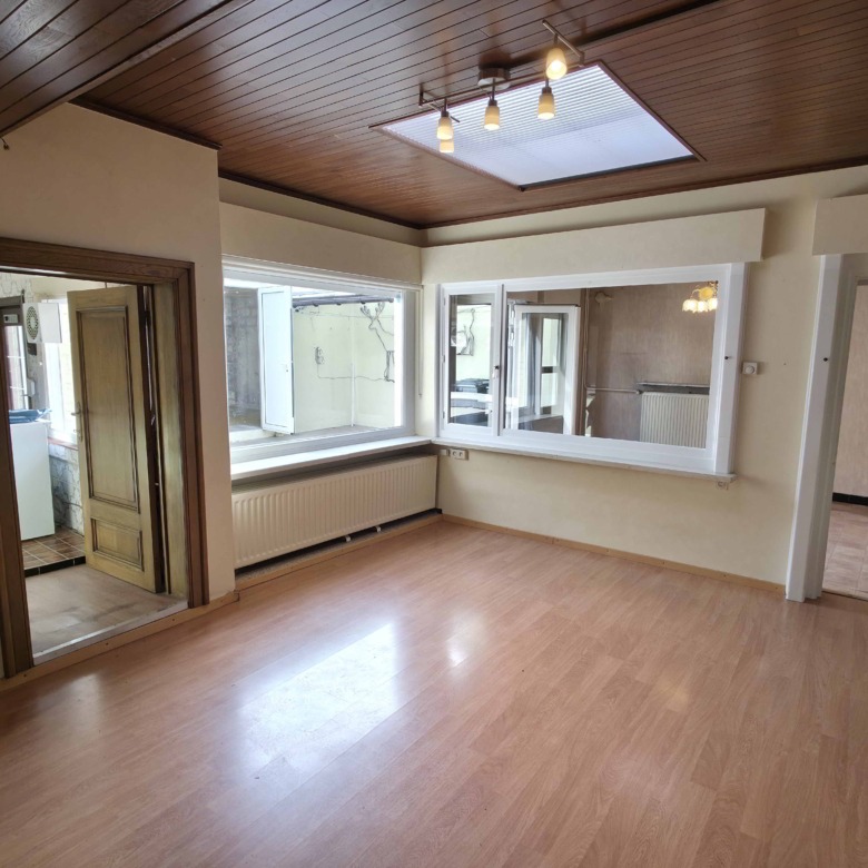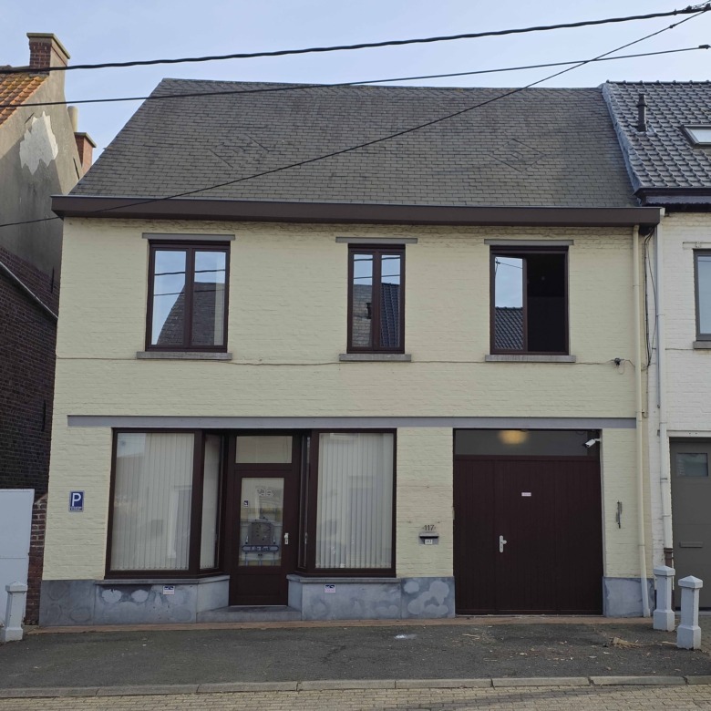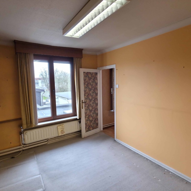 Bij binnenkomst betreedt u de woning via de voormalige winkelruimte, die toegang geeft tot de leefruimte met traphal en rechts de grote garage. Langs de leefruimte is de droge, propere kelder bereikbaar. Achter het hoofdgebouw vindt u een living en eetplaats onder het platte dak, met aansluitend een keukenruimte. Achter de keuken bevindt zich de technische ruimte met mazoutbrander en een badkamer met douche en lavabomeubel. Het apart en verzorgd toilet is ook toegankelijk langs het privatieve terras/koer. De woning is voorzien van rolluiken en deze zijn deels elektrisch op het gelijkvloers.