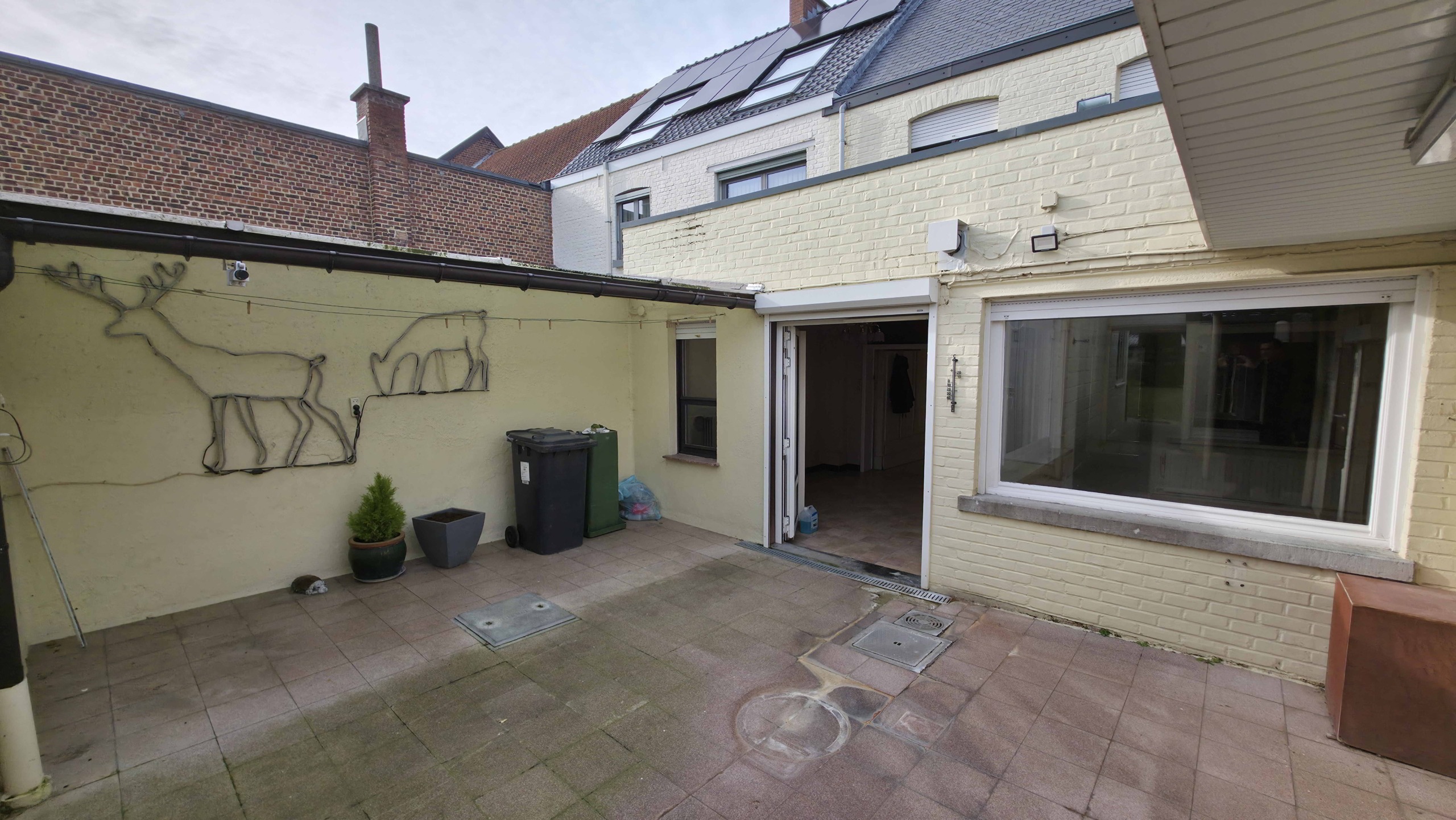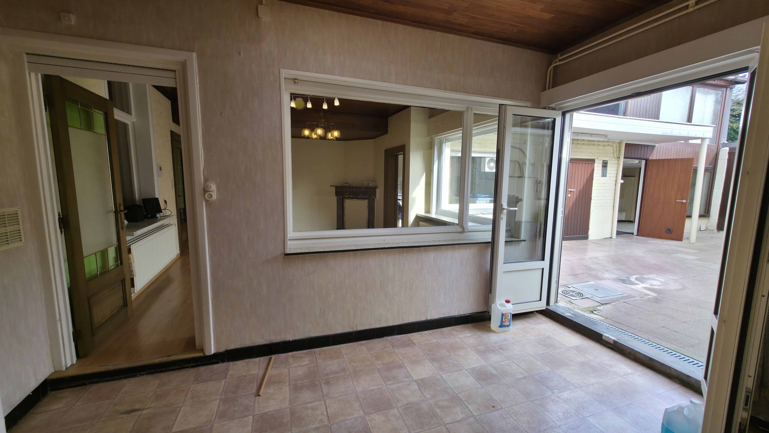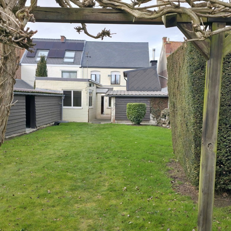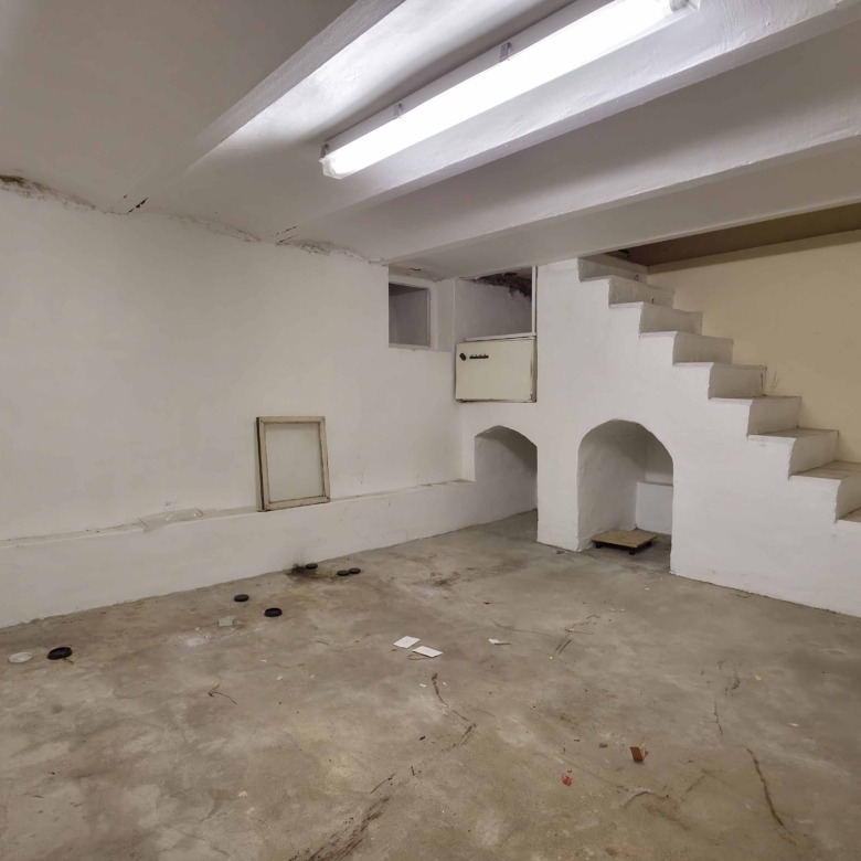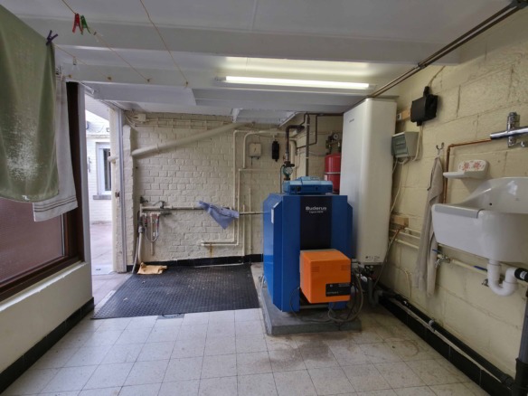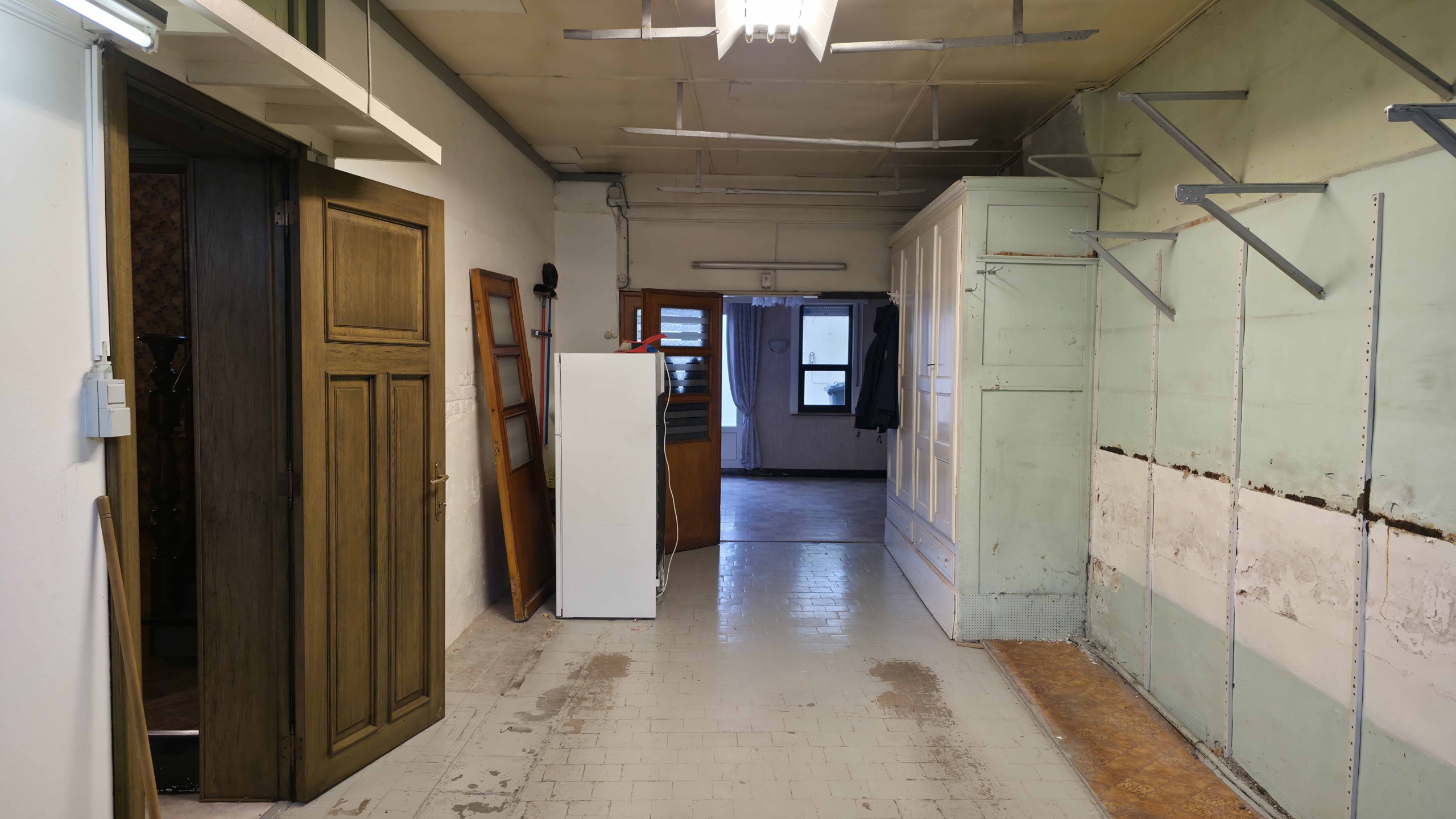 Bij binnenkomst betreedt u de woning via de voormalige winkelruimte, die toegang geeft tot de leefruimte met traphal en rechts de grote garage. Langs de leefruimte is de droge, propere kelder bereikbaar. Achter het hoofdgebouw vindt u een living en eetplaats onder het platte dak, met aansluitend een keukenruimte. Achter de keuken bevindt zich de technische ruimte met mazoutbrander en een badkamer met douche en lavabomeubel. Het apart en verzorgd toilet is ook toegankelijk langs het privatieve terras/koer. De woning is voorzien van rolluiken en deze zijn deels elektrisch op het gelijkvloers.