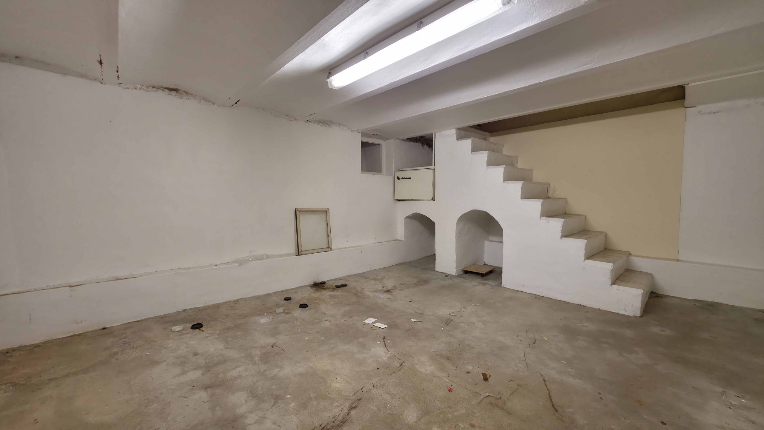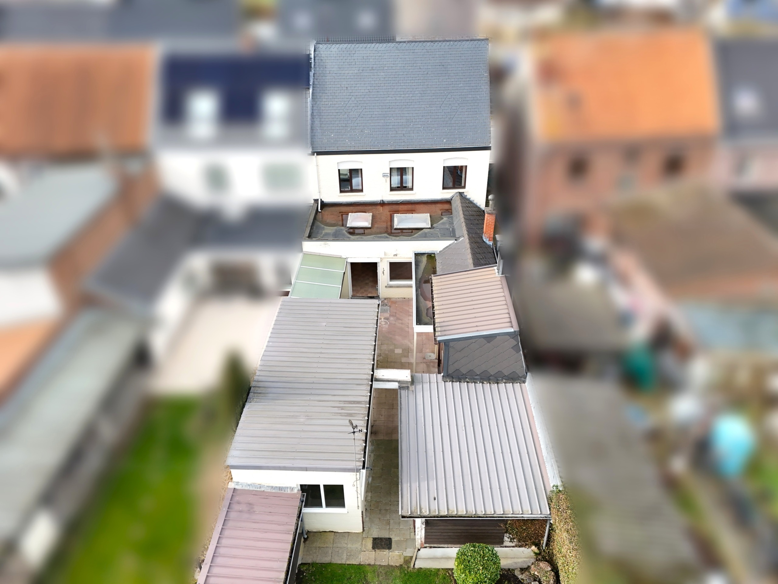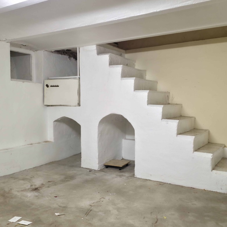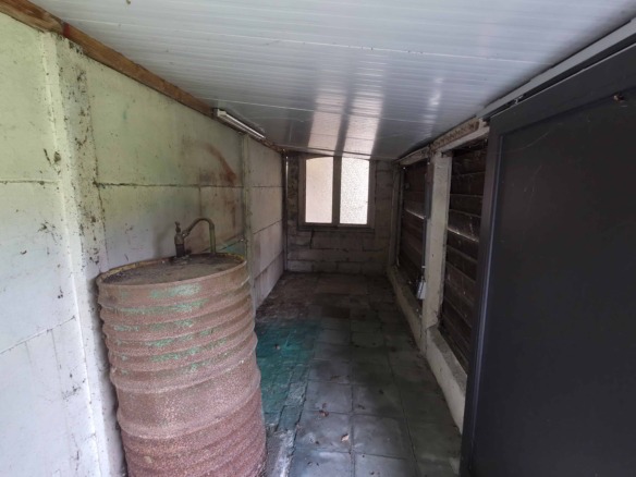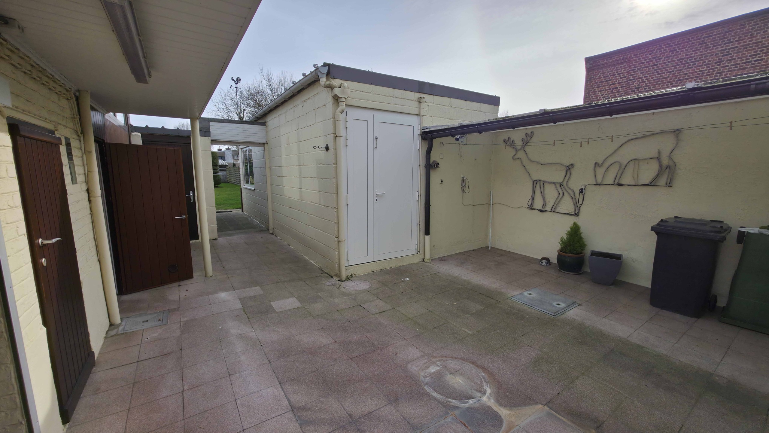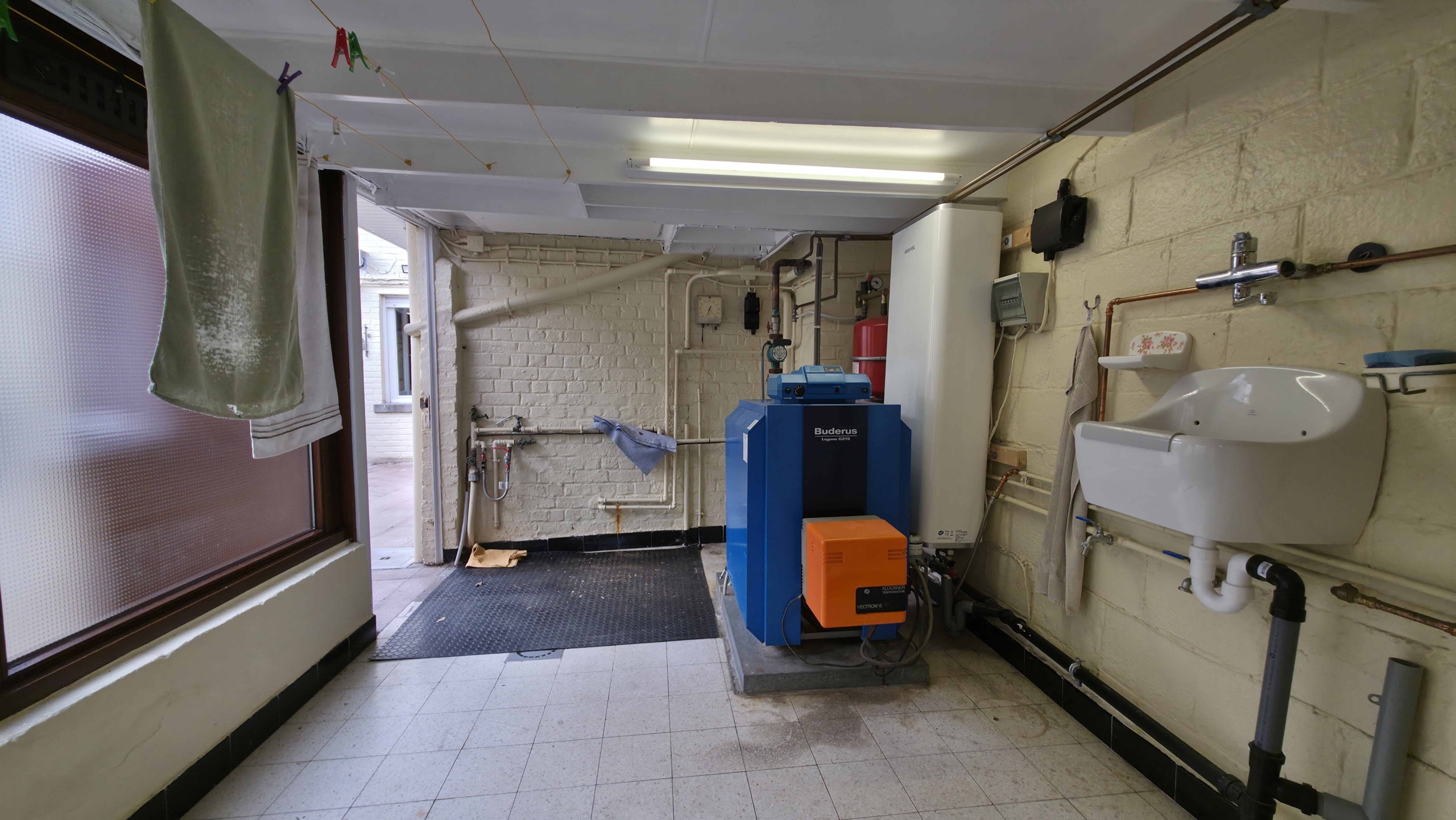 Bij binnenkomst betreedt u de woning via de voormalige winkelruimte, die toegang geeft tot de leefruimte met traphal en rechts de grote garage. Langs de leefruimte is de droge, propere kelder bereikbaar. Achter het hoofdgebouw vindt u een living en eetplaats onder het platte dak, met aansluitend een keukenruimte. Achter de keuken bevindt zich de technische ruimte met mazoutbrander en een badkamer met douche en lavabomeubel. Het apart en verzorgd toilet is ook toegankelijk langs het privatieve terras/koer. De woning is voorzien van rolluiken en deze zijn deels elektrisch op het gelijkvloers.