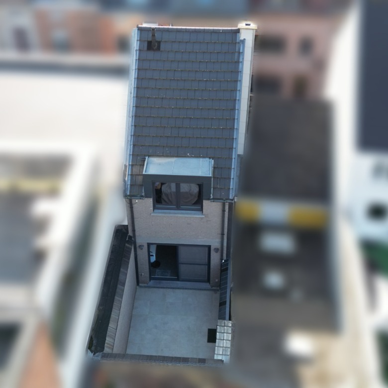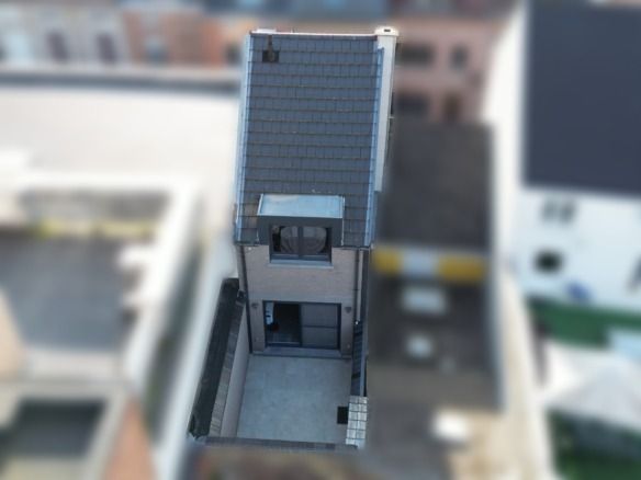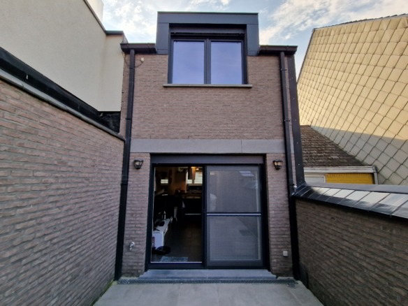 Eerste verdieping: via de trap met ledverlichting is er toegang tot de open leefruimte met zithoek, die via het grote schuifraam zicht geeft op het verrassend ruim terras. Eettafel die verbonden is aan de keuken om zo optimaal de ruimte te benutten.