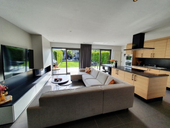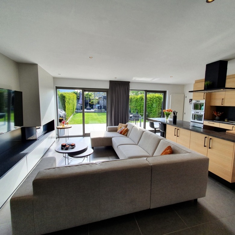 Indeling gelijkvloers: toffe inkomhal met bezoekerstoilet, langs de stalen deur betreden we de open leefruimte met eetplaats, comfortabele zithoek en open keuken. De grote raampartijen zorgen voor natuurlijke lichtinval en mooi zicht de tuin. Bij de keuken is er een grote berging met bijkeuken en in het verlengde betreden we ook de garage met automatische poort, niet alleen handig voor de boodschappen maar ook om vlot naar de tuin te gaan. De verzorgde en privatieve tuin heeft een groot terras, een handig tuinhuis met daarnaast een tweede gezellig terras. De ideale locatie voor de apéro!