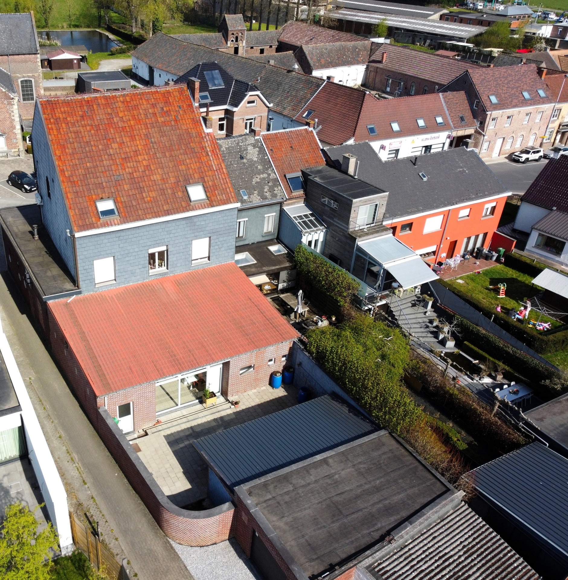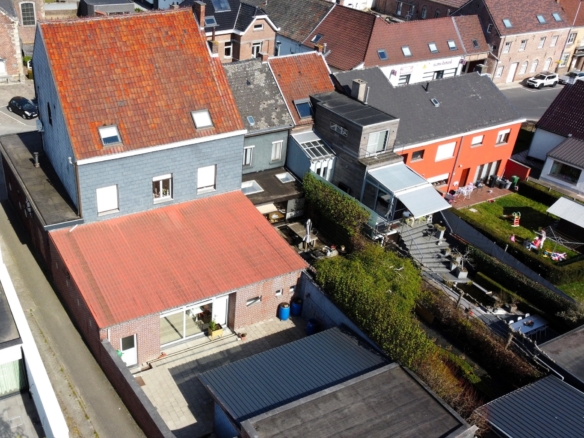 Er zijn twee grote voorkamers (48m² en 36m²), een sanitaire ruimte (13m²), een kamer met grote raampartijen (24m²) met zicht op het terras (48m²) en een grote keuken (21m²). Ook is er een technische ruimte en garage met zolder (20m²). Via het terras of het straatje langszij kunnen we naar de grote garage met bergruimte en sectionaalpoort (65m²).